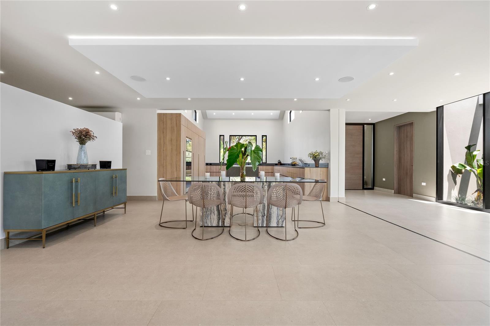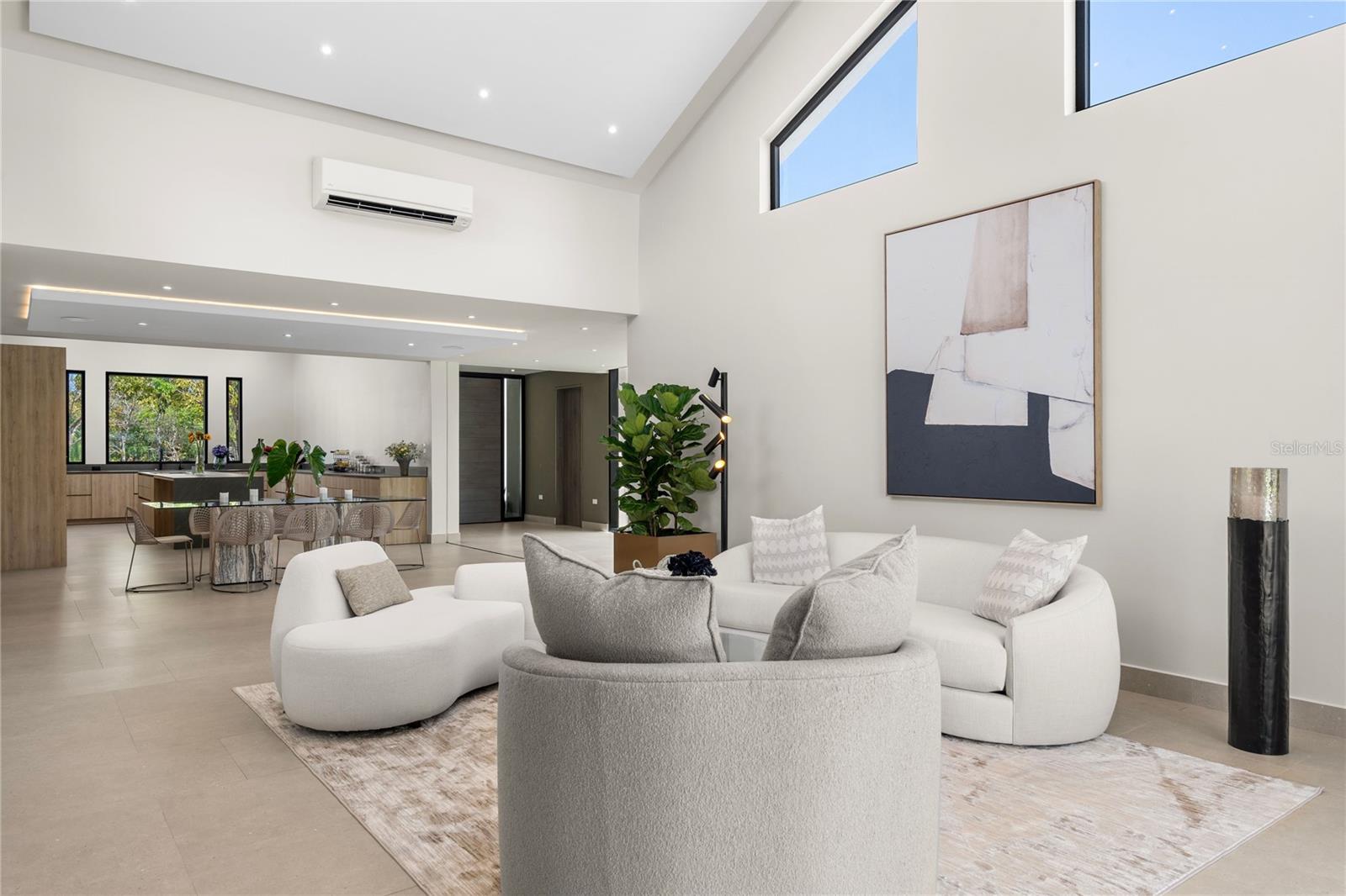 As you enter, you're greeted by an expansive foyer leading to an open-concept living area, accentuated by soaring vaulted ceilings and magnificent floor-to-ceiling windows that bathe the space in natural light. The elegant living room flows seamlessly into a state-of-the-art gourmet kitchen, complete with high-end built-in appliances, custom cabinetry, and a generously sized island that serves as both a centerpiece for culinary creations and a perfect gathering spot for family and friends. This kitchen is a chef's dream, designed for both functionality and flair.