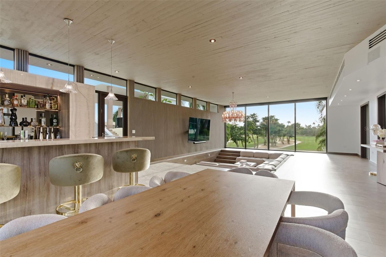 The home's second-level expansion is a destination of its own, designed for world-class entertainment and elevated living. This level features a rooftop outdoor kitchen equipped with a Grillworks grill, beverage fridge, and ice maker; a stunning glass jacuzzi with panoramic ocean and fairway vistas; and an expansive sunken lounge ideal for gatherings or nightlife experiences. Additional amenities include a backlit marble bar accented with Baccarat lighting, an upstairs bar, a temperature-controlled wine cellar, cigar humidor, dedicated office, and a half bathroom. A fully equipped media room with sound-paneled walls and a kitchenette with Wolf induction cooktop provides the perfect environment for cinema, gaming, education, or studio use. Also located on this level is a complete in-law/guest suite offering a kitchenette, custom Italian closets, soaring ceilings, and a spa-quality marble bathroom with a freestanding porcelain tub.