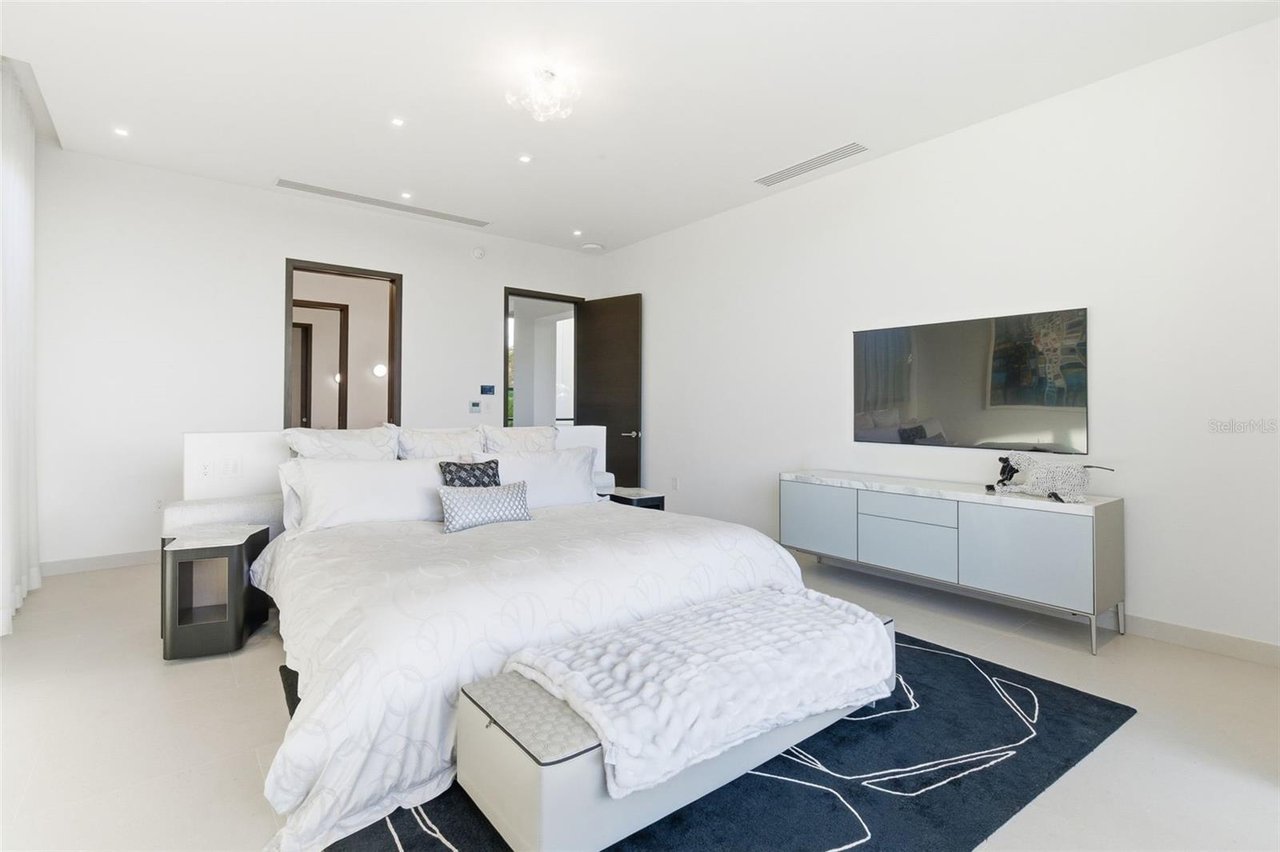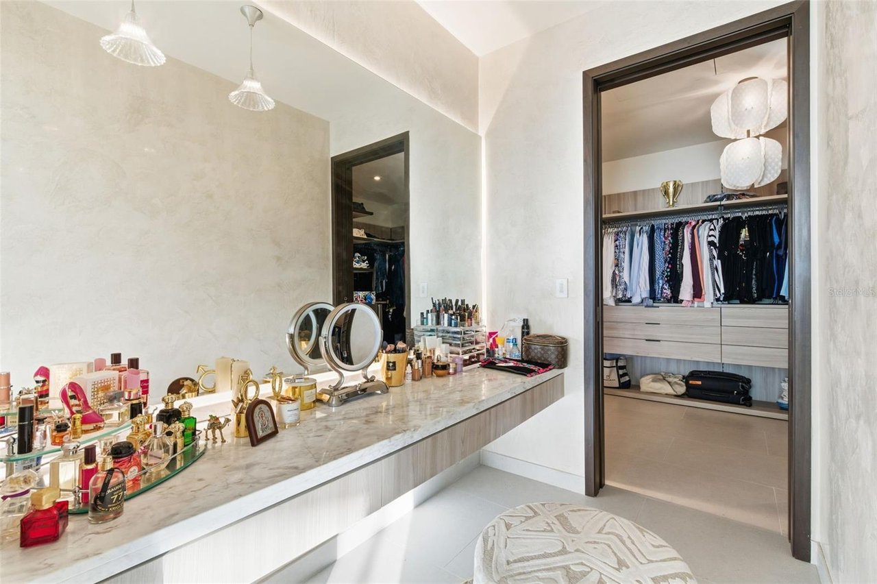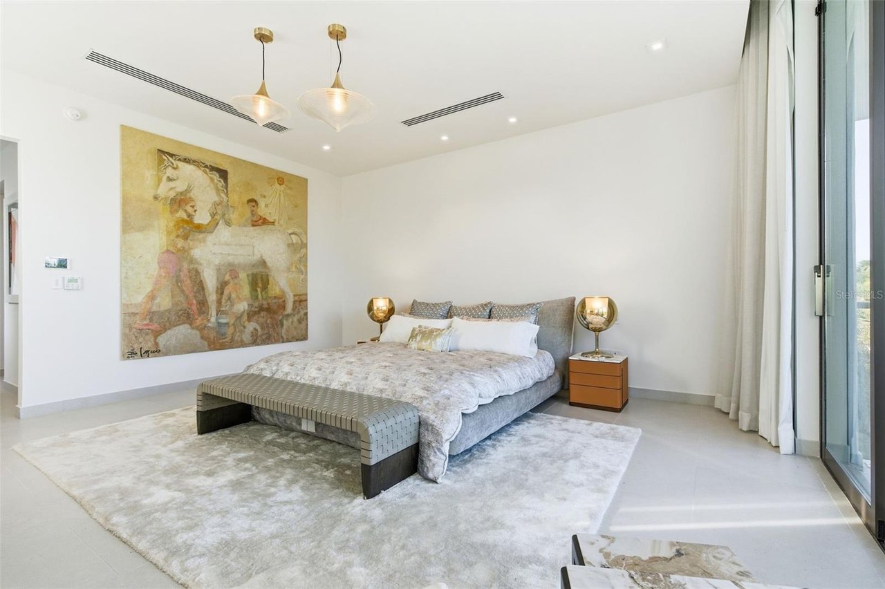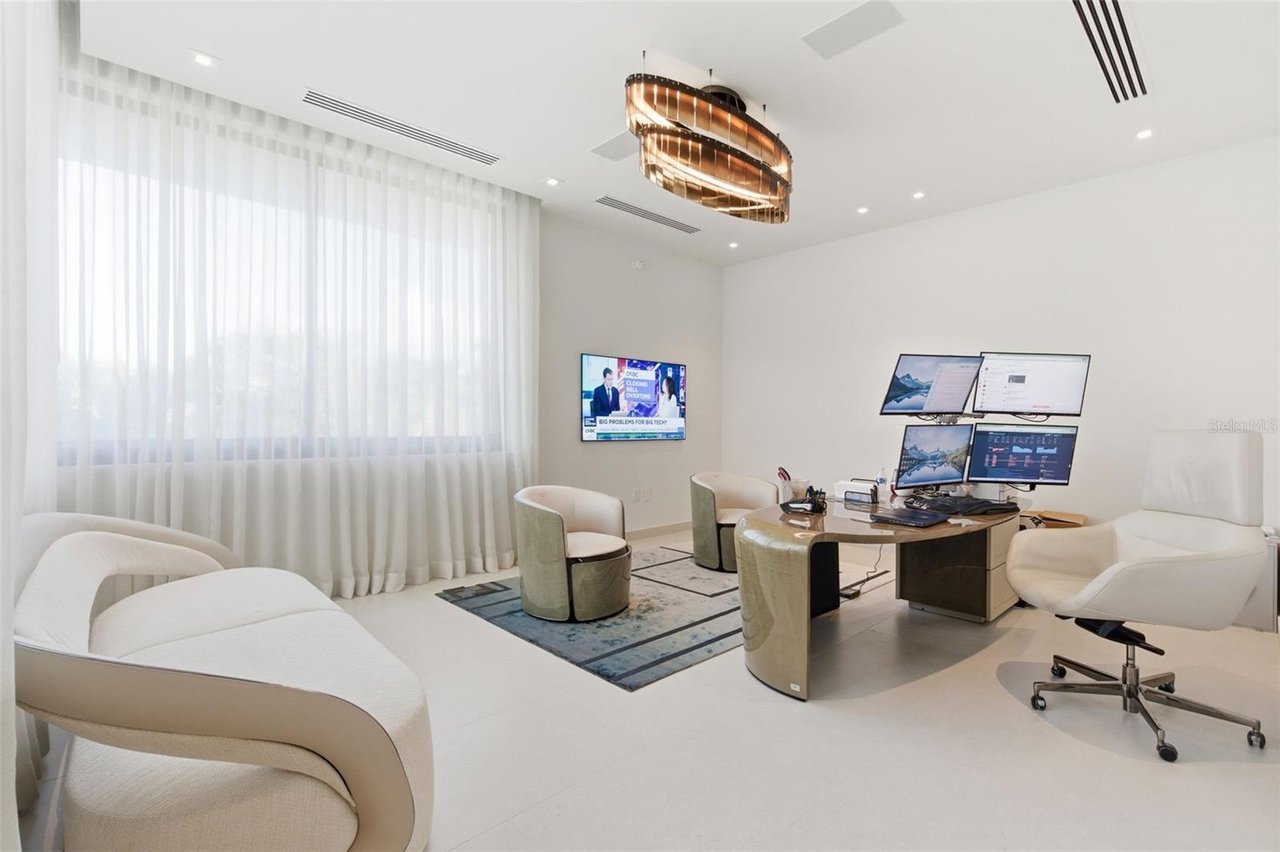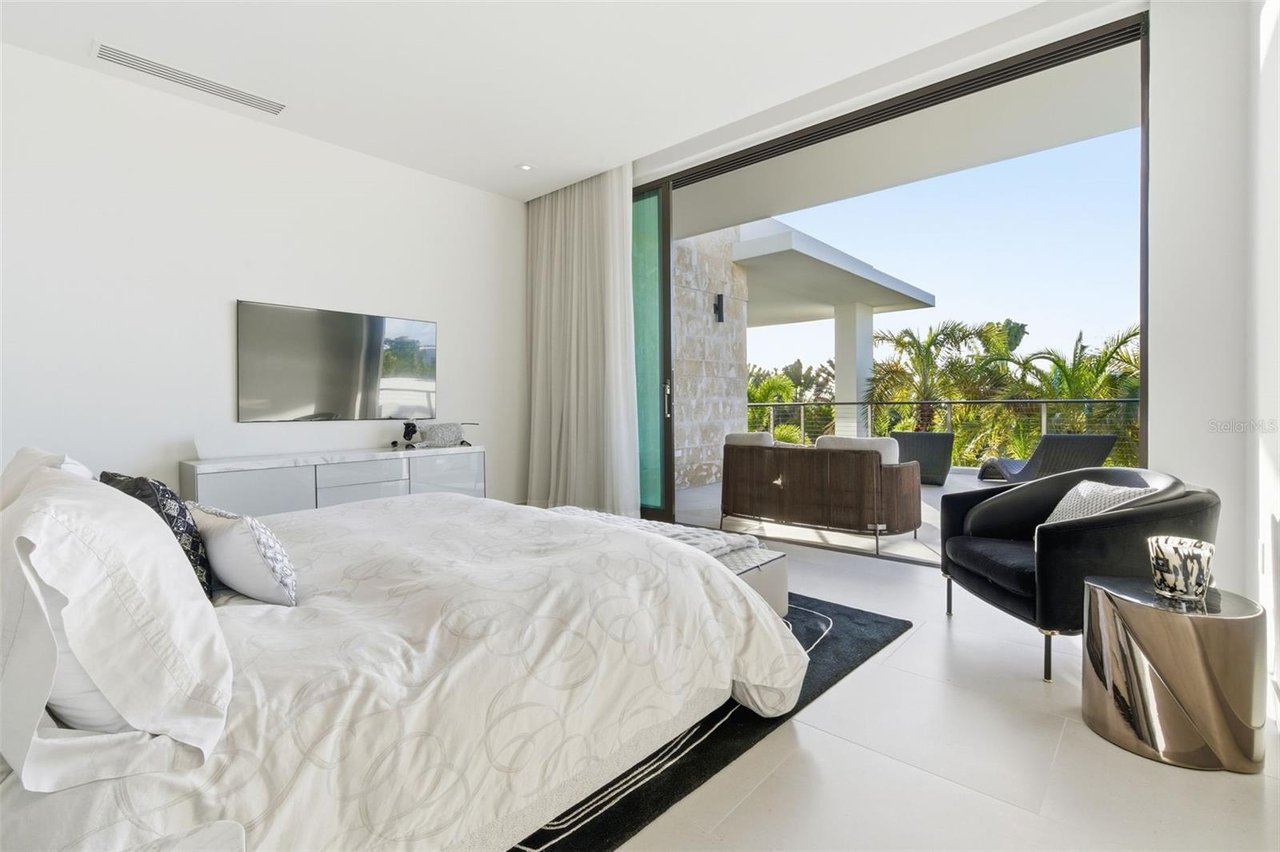 The residence features three bedroom suites on the main level, each opening to private terraces, while the upper level is dedicated to two additional bedrooms and an expansive primary suite occupying its own wing. The primary retreat offers a generous private terrace, an oversized walk-in closet with center island, and a spa-inspired bathroom with an outdoor shower. A private office, an independent guest suite with its own entrance, and a dedicated salon space further elevate the home's versatility and exclusivity.