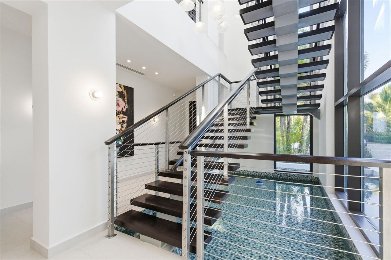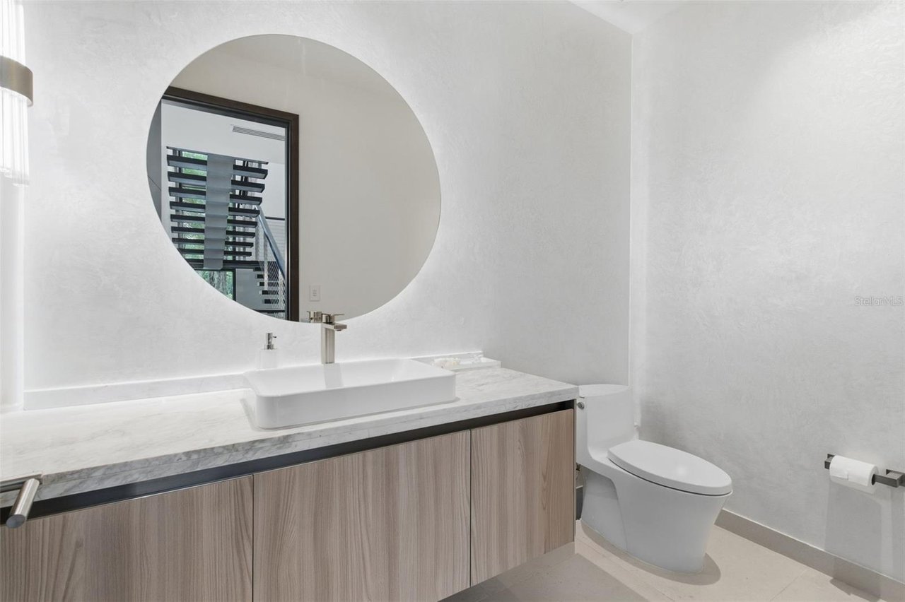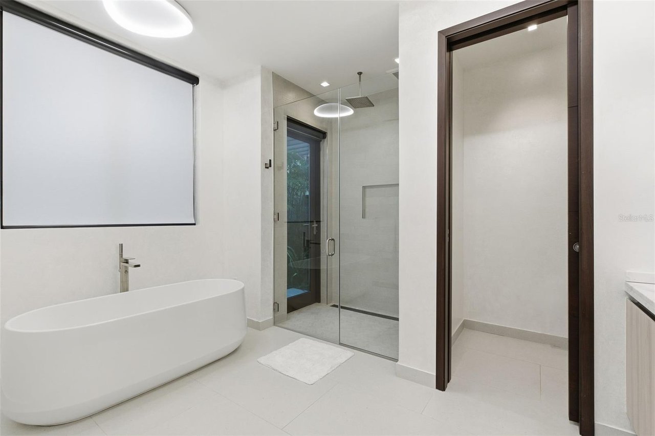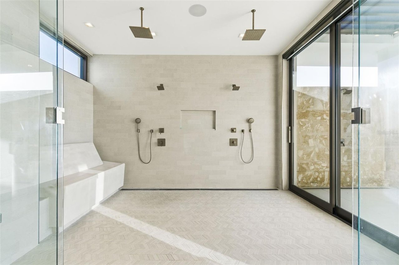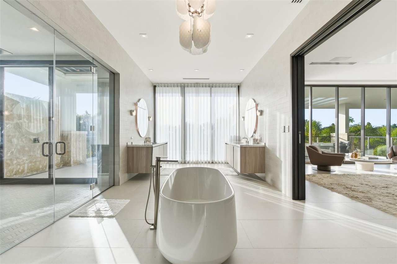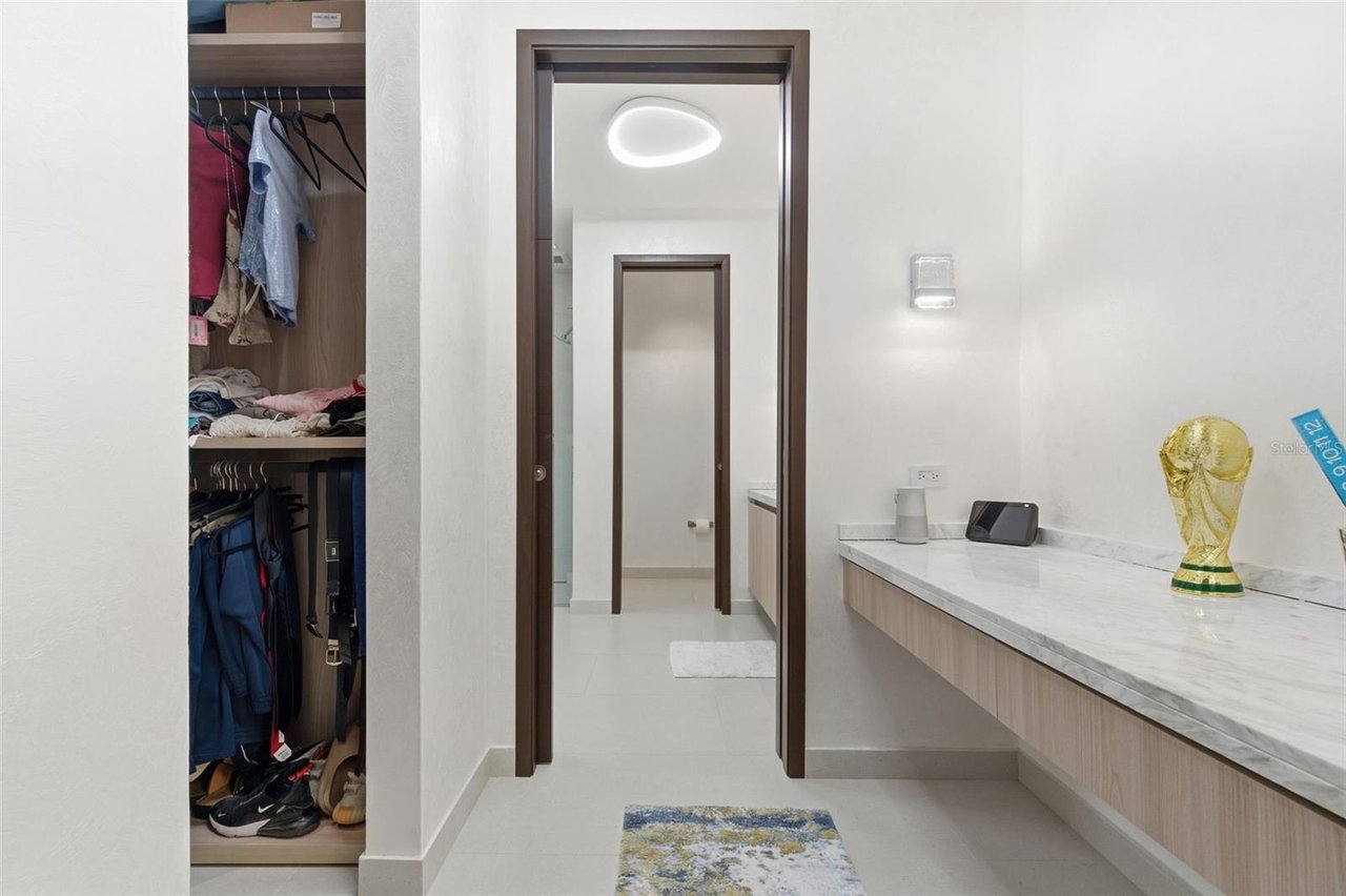 The residence features three bedroom suites on the main level, each opening to private terraces, while the upper level is dedicated to two additional bedrooms and an expansive primary suite occupying its own wing. The primary retreat offers a generous private terrace, an oversized walk-in closet with center island, and a spa-inspired bathroom with an outdoor shower. A private office, an independent guest suite with its own entrance, and a dedicated salon space further elevate the home's versatility and exclusivity.